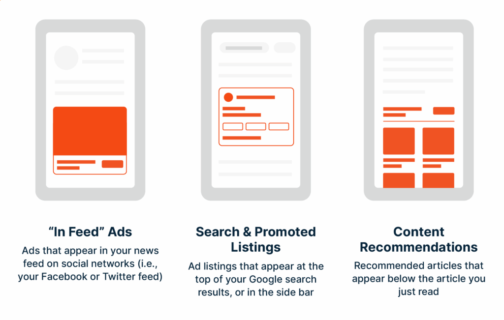 - App Native Ads: Within mobile apps, these appear as content cards in scrollable feeds