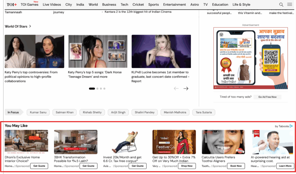 - Taboola/Outbrain on News Sites: Visit CNN.com or Times of India, scroll to article bottom for “You May Like” widgets